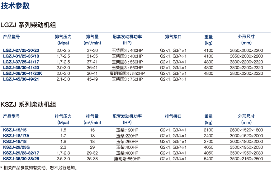 型号 | 排气量 | 排气压力 | 配套柴油机型号 | 重量 kg | 外形尺寸 |